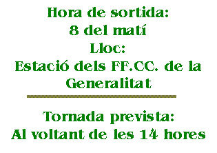 Notes: * Pressupost: 4 € (billets d’anada i tornada en tren). * Lloc i hora de sortida: Estació dels FFCC de la Generalitat, a les 8 del matí. * Tornada prevista al voltant de les 14 hores * Més informació i inscripcions al 609.403.750 (de 18 a 21 h). |