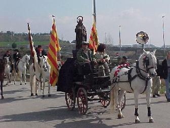 El carruaje con Sant Antoni Abat y detrás caballista con el estandarte.